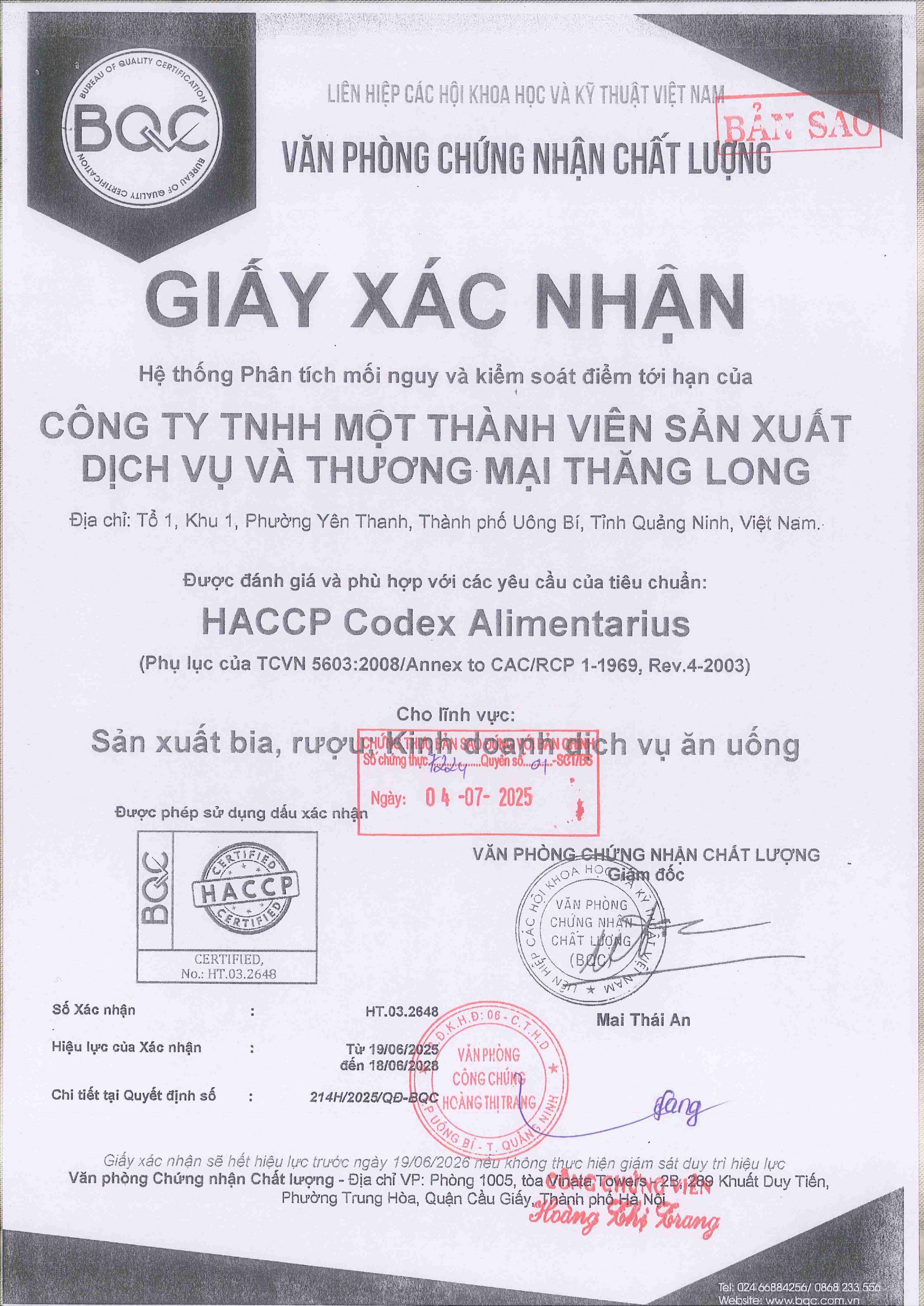 Giấy chứng nhận đạt tiêu chuẩn HACCP